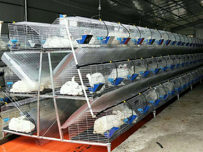階梯式鐵絲兔籠由籠體、籠門、籠底(踏網、踏板、底板)、側網(兩側及后部)、籠頂(頂網)及承糞板等組成。